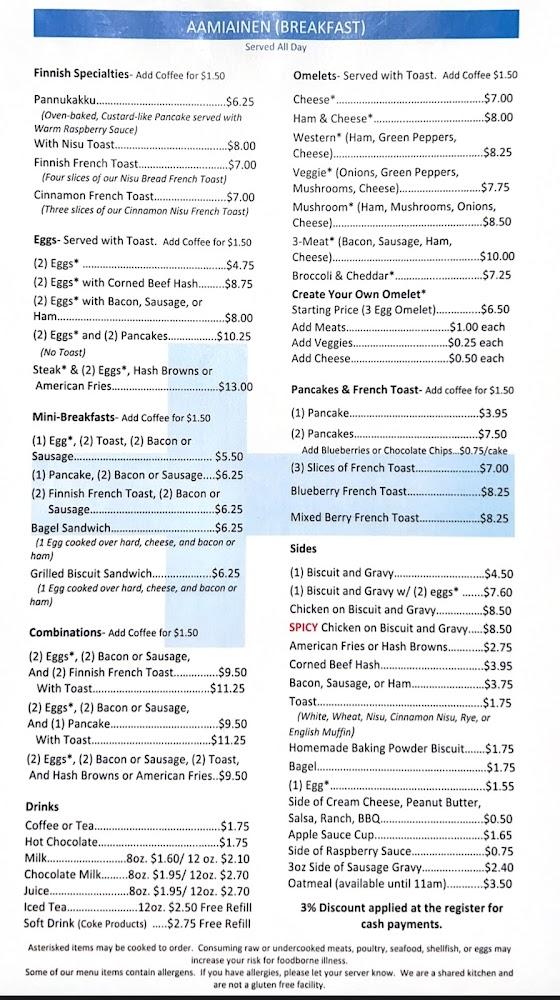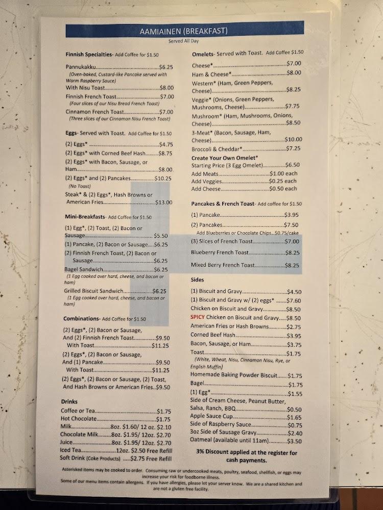The menu at Suomi features a perfect blend of traditional Finnish and classic American dishes. Breakfast lovers rejoice with hearty options like pancakes, omelets, and the famed Pannukakku. Each dish bursts with flavor. Don't miss out on the homemade pastries.